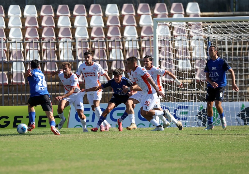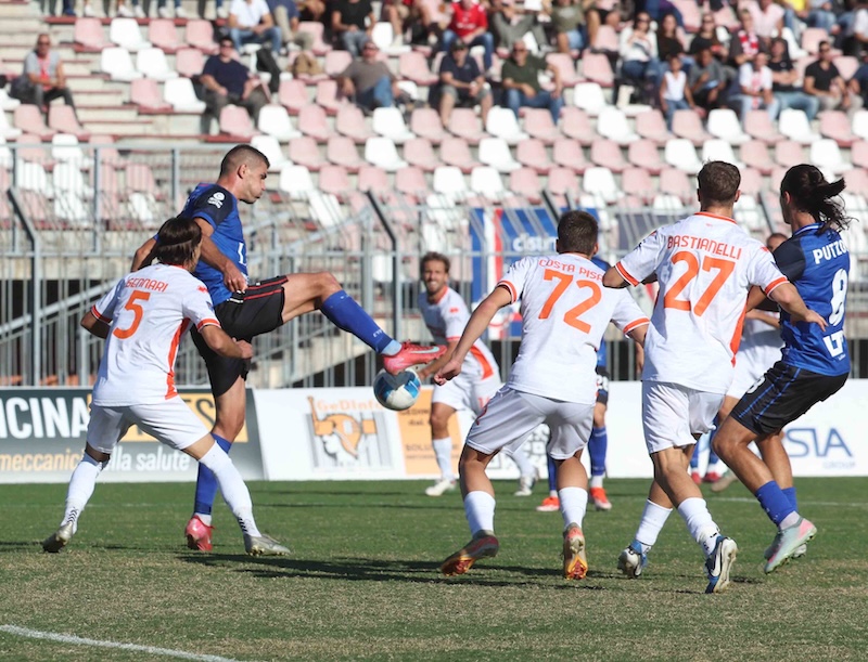 Franzini, che ritrova Sbardella al centro della difesa, conferma Taugourdeau in cabina di regia e schiera sulla linea mediana Lordkipanidze e Putzolu. Nella prima frazione l’equilibrio viene rotto da Valentini, che al 35’ porta avanti i toscani con una rasoiata mancina. Poco dopo la palla dell’1-1 capita sulla testa di Mustacchio, ma Giuliani compie un grande intervento.