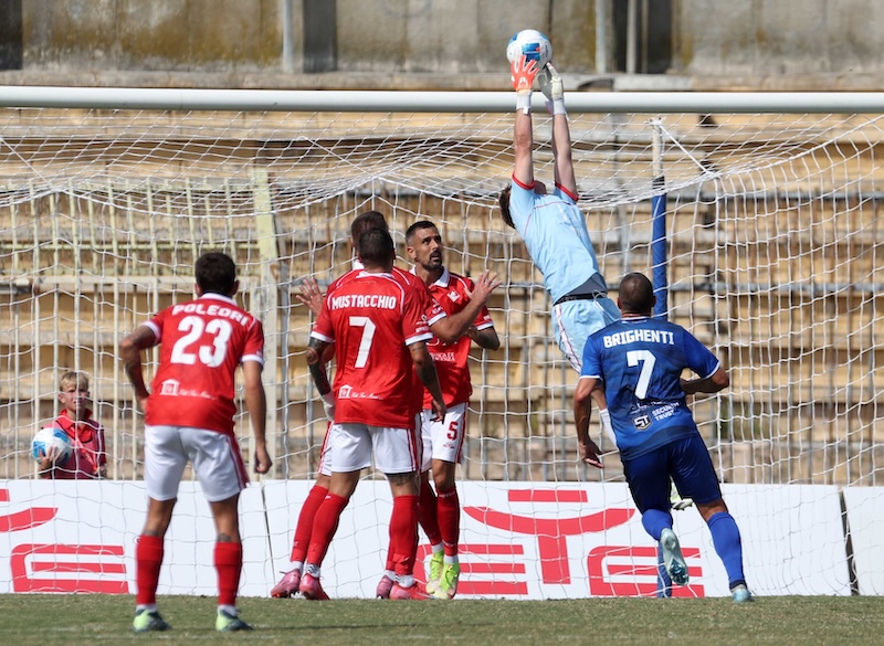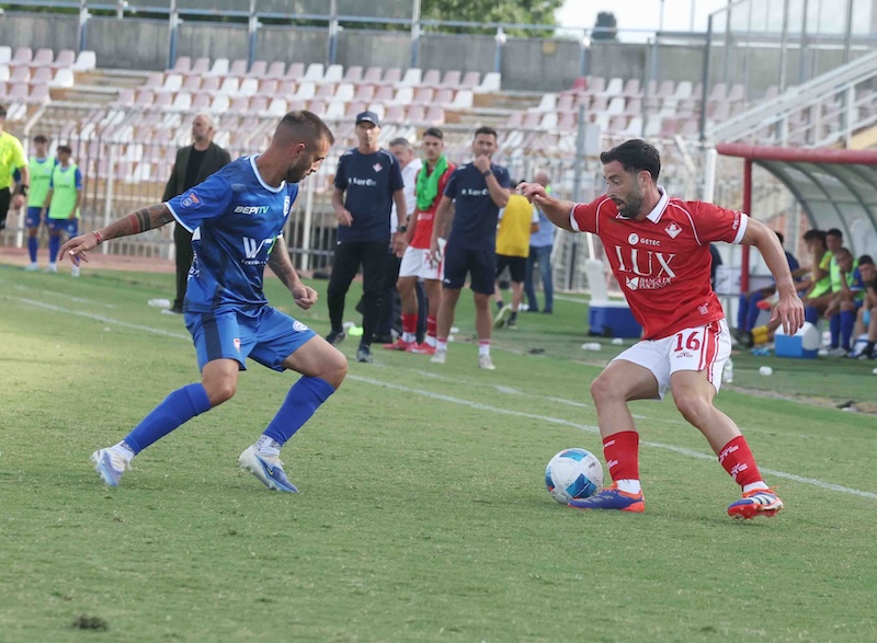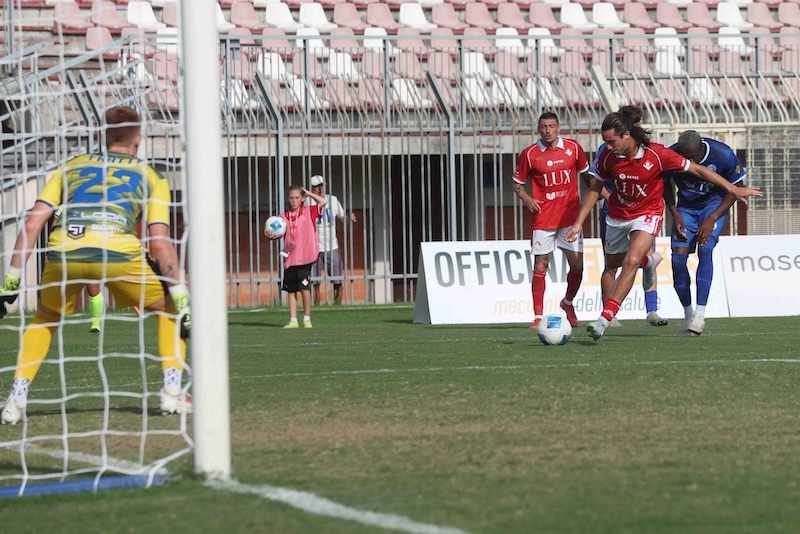 Franzini sceglie un 4-3-3 che prevede Taugourdeau in cabina di regia e Trombetta a guidare il tridente offensivo completato da Mustacchio e D’Agostino. Il primo tempo è tanto combattuto quanto equilibrato e le occasioni latitano, mentre nella ripresa la partita si accende quando Mustacchio coglie una traversa con un sinistro di prima intenzione toccato da Fratti.