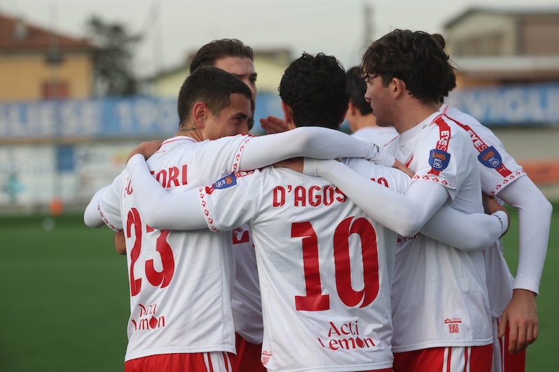Franzini schiera Cabri e Bertin sulla fasce, Campagna sulla trequarti e D’Agostino a supporto di Trombetta in attacco. Dopo meno di 5’, i biancorossi conducono per 2-0 grazie alle reti di D’Agostino e Poledri, liberato al tiro proprio dal numero 10 emiliano su uno schema da corner. Gli ospiti continuano ad attaccare e a creare occasioni finché, poco prima della mezz’ora, D’Agostino firma la sua doppietta personale con una stoccata mancina. La Trevigliese non resta certo a guardare e, nel finale della prima frazione, trova il gol con Montalbano, bravo a battere Ribero con un preciso diagonale.